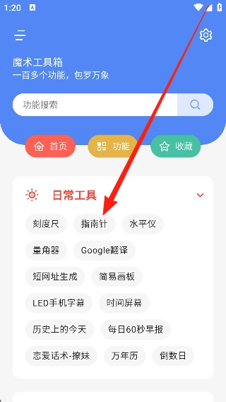 2、在功能页展开【日常工具】,点击【指南针】选项,启动指南针功能。