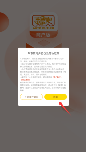 1进入车事帮智慧门店系统后,会出现用户协议与隐私政策的提示窗口,使用前请详细阅读相关条款并确认同意。