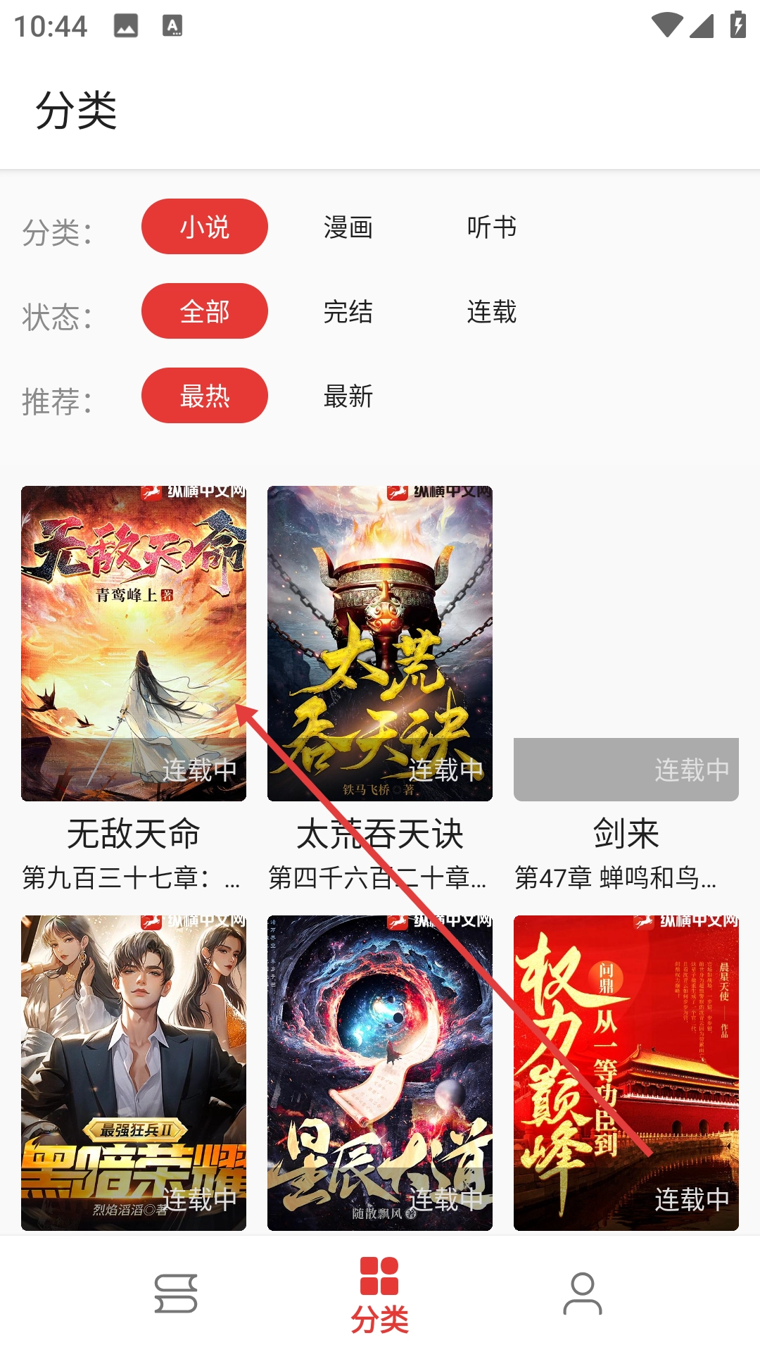 1、点击底部“分类”按钮,进入小说分类页面。