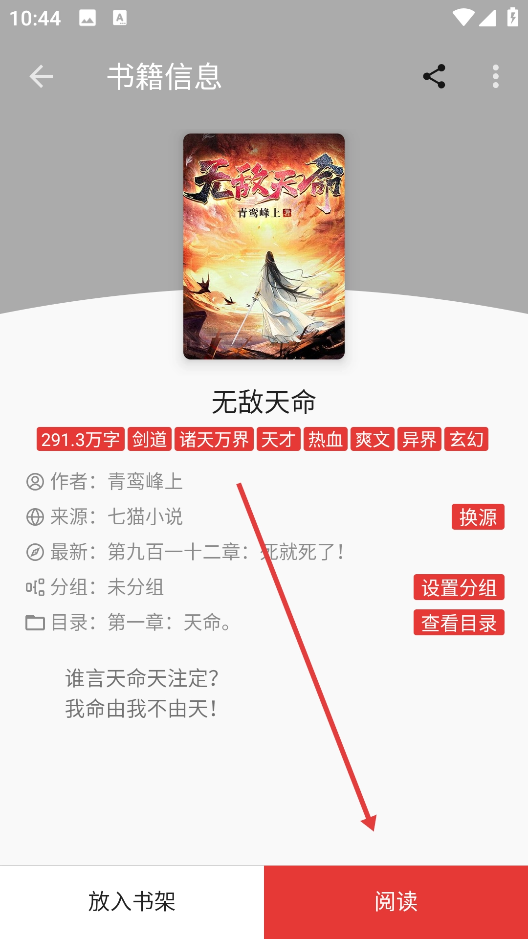 3、在搜索结果里找到《无敌天命》并点击,即可进入该书的信息页面。