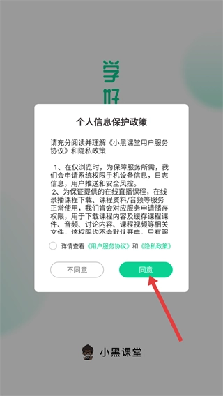 在小黑课堂弹出的【个人信息保护政策】窗口中,点击【同意】按钮,在确认相关政策内容后即可进入应用的主界面。