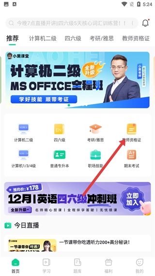 进入主界面后,点击【教师资格证】分类入口,即可进入教师资格证相关课程的页面。
