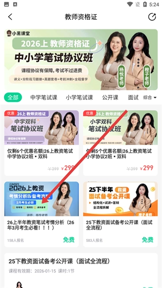 3、进入教师资格证课程页面后,挑选目标课程(例如【26上半年教资笔试考情分析】),再进入该课程的详情页面。