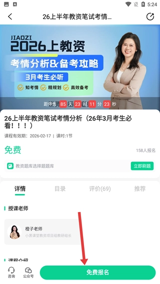 4、进入课程详情页面后,找到并点击【免费报名】按钮,即可完成该课程的报名流程。