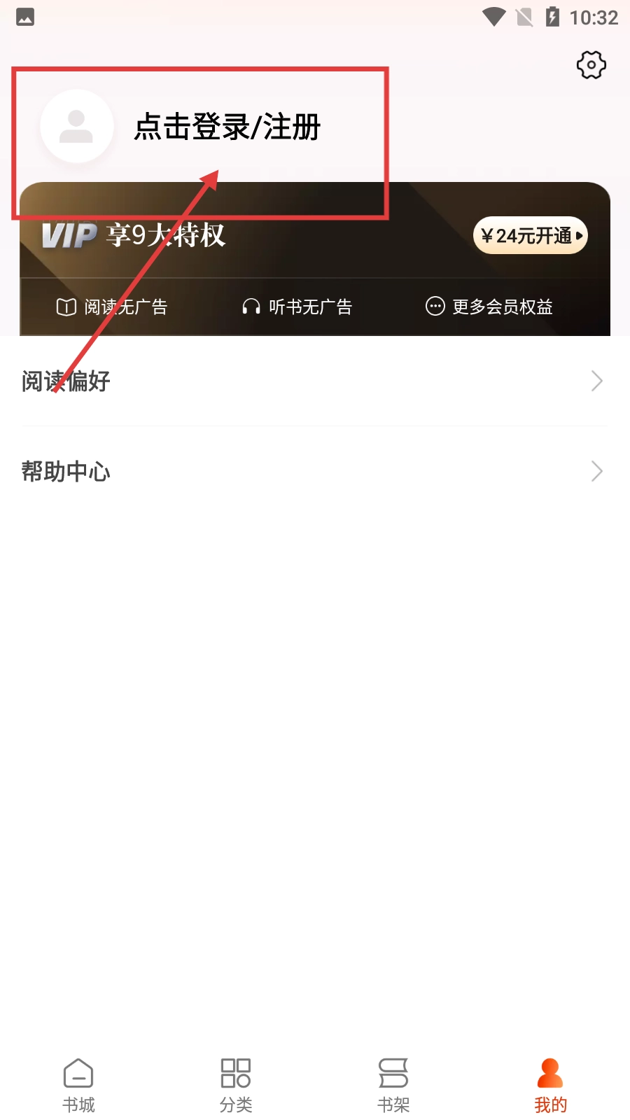 1、在书城界面,点击底部【我的】按钮,可进入个人页面,进行登录、查看阅读偏好等操作。