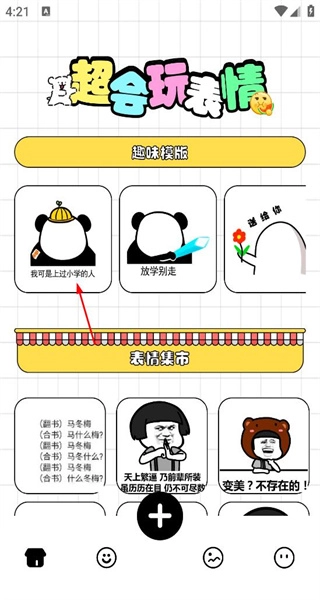 1、打开软件后,进入首页,看到趣味模版和表情集市板块,点击趣味模版中的我可是上过小学的人,进入图片选择界面。