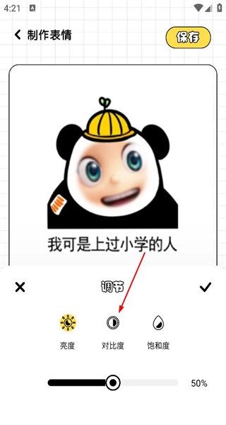 3、在表情制作界面,看到亮度、对比度、饱和度的调节选项,调整对比度参数,对表情效果进行优化。