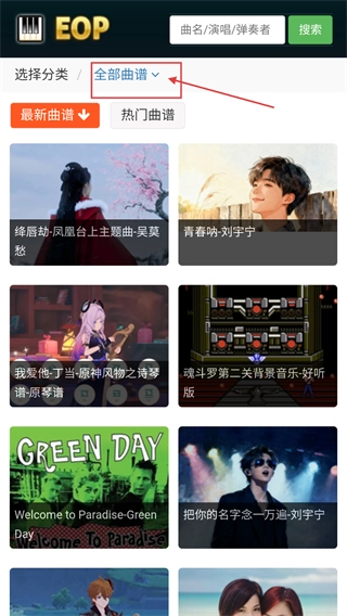 1、进入【EOP】界面后,你可以借助顶部的搜索框搜索曲名,也能点击【全部曲谱】来浏览曲库,还能切换到【最新曲谱】【热门曲谱】板块查看相应内容。