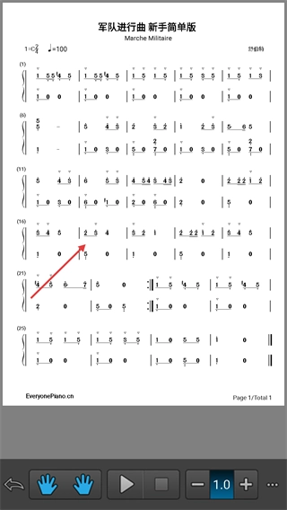 4、进入《军队进行曲-新手简单版》的曲谱页面,就能查看完整的乐谱内容,还可以通过底部的操作按钮来调整相关设置,进而开启演奏练习。