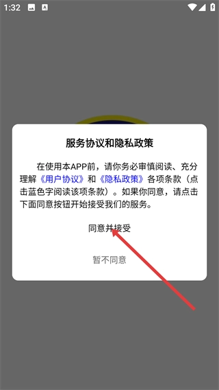 1、在“服务协议和隐私政策”弹窗中,阅读《用户协议》《隐私政策》条款后,点击“同意并接受”按钮,进入登录/注册界面。