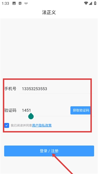 2、在“法正义”对应的登录/注册界面,确认已填写手机号、验证码并勾选同意协议后,点击“登录/注册”按钮,完成账号的登录或注册操作。