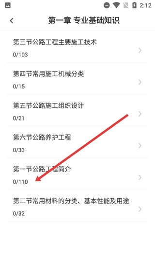 3、进入【第一章专业基础知识】页面后,挑选想要练习的小节(例如【第一节公路工程简介】),点击该小节即可进入对应的题目练习页面。