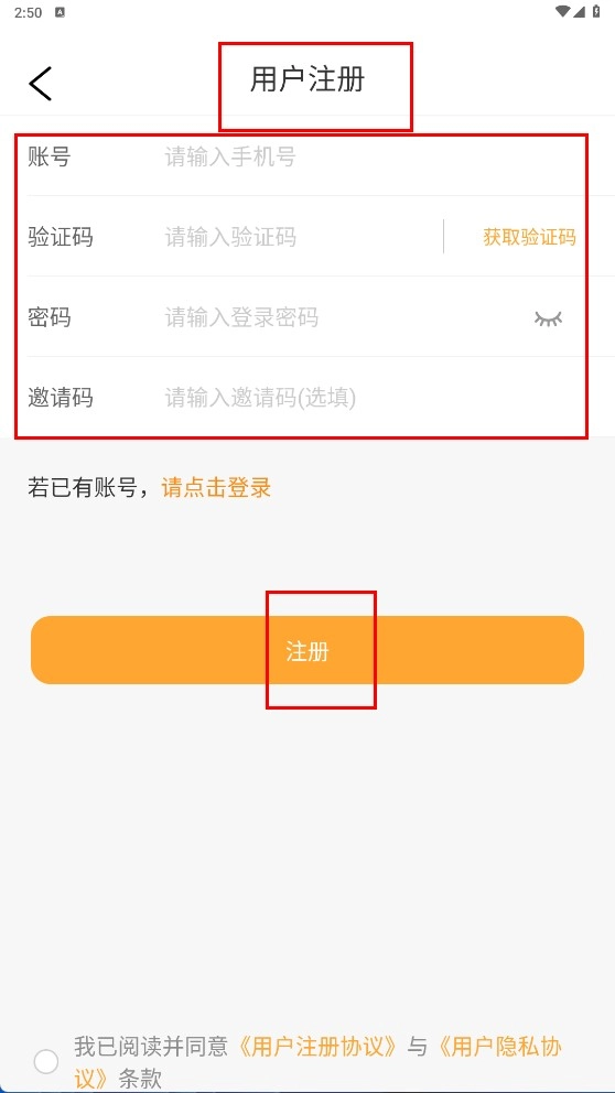 4、进入【用户注册】页面,按顺序填写手机号、验证码、密码(邀请码为选填项),勾选相关协议后点击【注册】按钮,即可完成账号注册流程。