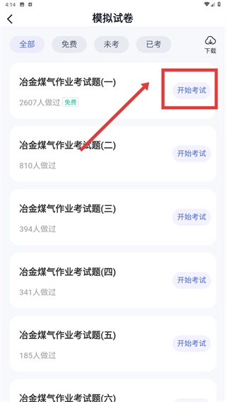 2、在模拟试卷列表中找到《冶金煤气作业考试题(一)》,点击该试卷右侧的【开始考试】按钮,即可进入试卷详情页面。