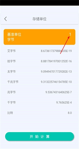 3、选择存储单位分类,进入对应转换页面,基准单位设为字节,输入数值,准备进行转换。