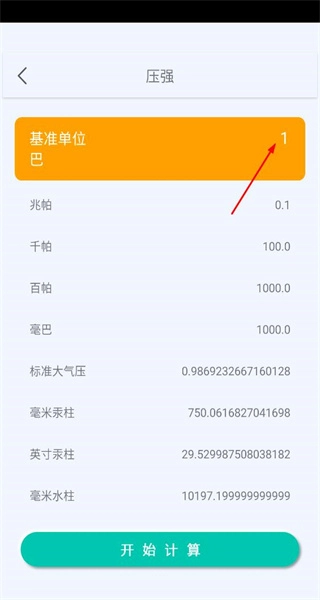 4、选择压强分类进入其转换页面,基准单位设为巴,输入数值,点击开始计算完成转换操作。