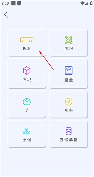 1、打开软件后,看到长度面积体积等单位分类选项,选择长度选项,进入长度单位的转换设置页面。