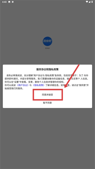 1、在“药你好”的服务协议与隐私政策弹窗,阅读《用户协议》《隐私政策》后,点击【同意并接受】按钮,进入应用登录流程。