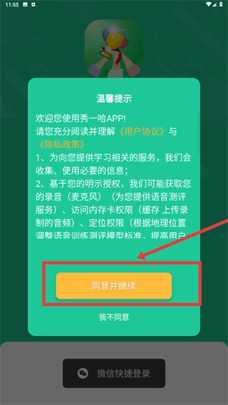 1、在【秀一哈】的温馨提示界面,仔细阅读《用户协议》和《隐私政策》后,点击“同意并继续”按钮,即可进入登录环节。