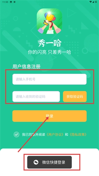 在用户信息注册界面,用户可以选择输入手机号并获取验证码后点击“登录”按钮,也可以直接通过“微信快捷登录”功能来完成账号登录操作。