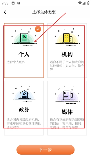 3、进入创作相关流程后,在【选择主体类型】页面勾选【个人】选项(此选项适用于个人创作场景),接着点击“下一步”按钮以继续推进申请流程。