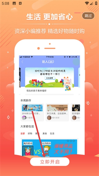 2、在应用引导页,查看【资深小编推荐-精选好物随时购】的介绍,点击【跳过】按钮快速进入应用。