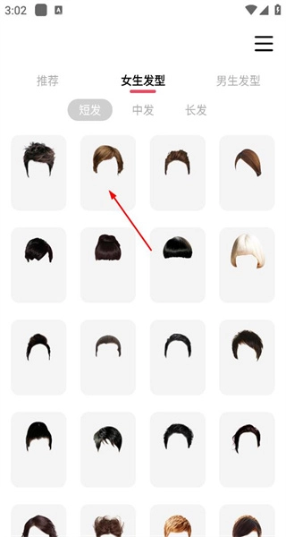 打开软件后,进入女生发型页面,切换到短发分类,浏览各种短发样式,查看不同的发型效果。
