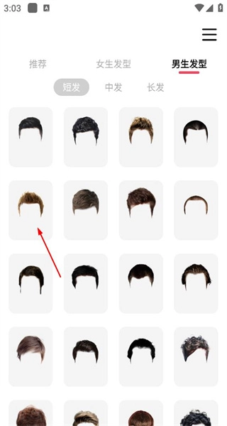 4、切换到男生发型的短发类别,浏览相应的发型样式,查看不同款式男生短发的呈现效果。