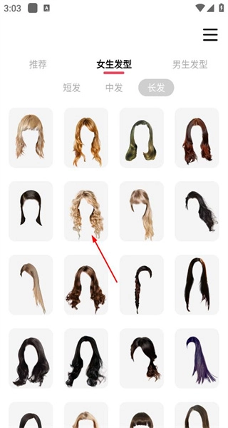 3、切换到女生发型里的长发类别,浏览各式各样的长发造型,查看不同卷度和颜色下的长发展示效果。