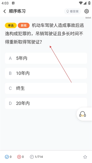 4、在顺序练习的题目页面,先查看单选题的题干内容,再选择与之对应的选项来完成作答。