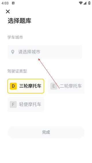 1、进入选择题库页面后,先选定学车城市和驾驶证类型,再点击完成按钮进行确认。