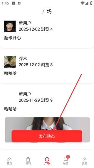 2、在【广场】页面,点击底部【发布动态】按钮,可进入动态编辑与发布界面。