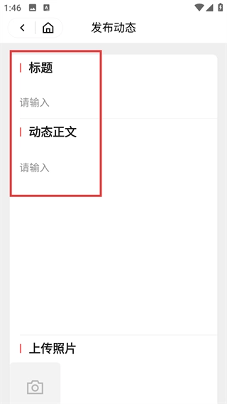 3、在【发布动态】页面,依次填写【标题】和【动态正文】的内容,还可选择上传照片。