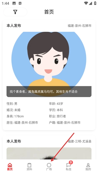 1、进入【首页】页面,点击底部导航栏的【广场】选项,可切换至动态展示页面。