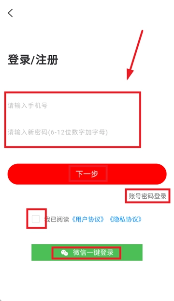 进入登录页面后,先输入手机号和验证码,接着勾选“我已阅读《用户协议》《隐私协议》”,然后点击登录按钮就能完成登录;另外,也可以选择账号密码登录或微信一键登录的方式。