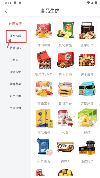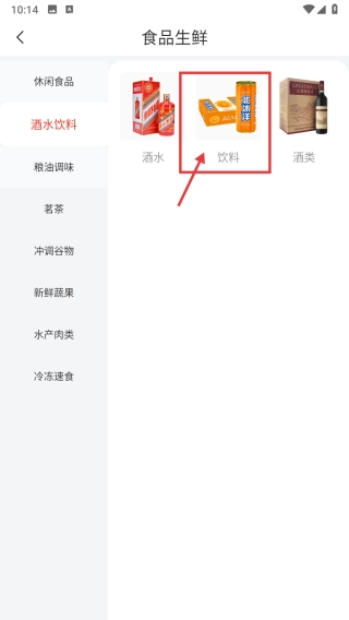 2、在食品生鲜页面,点击酒水饮料分类标签,进入酒水饮料分类页面。