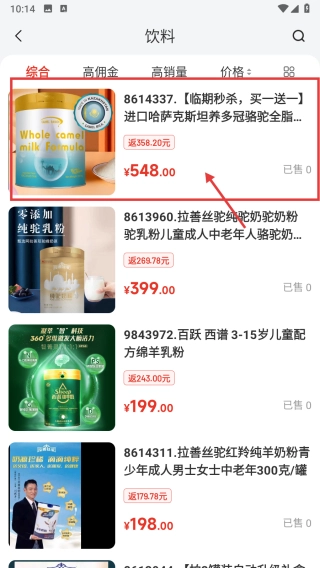 4、在饮料商品列表页面,查看进口哈萨克斯坦养多冠骆驼全脂奶粉商品详情。