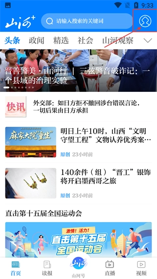 1、进入【山河+】首页后,点击右上角的个人图标按钮,可进入个人功能相关页面。