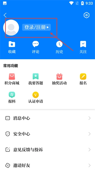 2、在个人页面中,找到【登录/注册】按钮并点击,即可进入账号的登录注册界面。