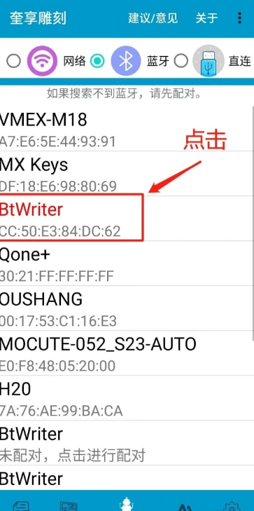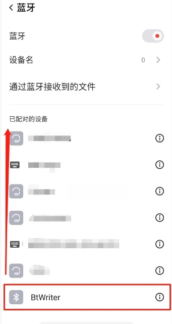 机器插上电源后稍等一会然后打开手机蓝牙搜索界面找到新设备(BtWriter)点击进行配对,配对成功后会出现在已配对那一栏