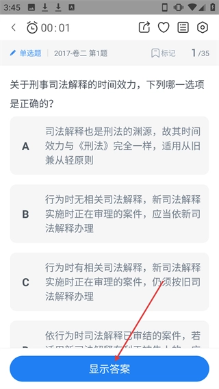 4、进入题目页面后,点击【显示答案】可查看题目答案。