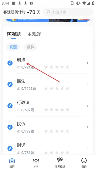 2、在刷题页面选择【刑法】科目进入。