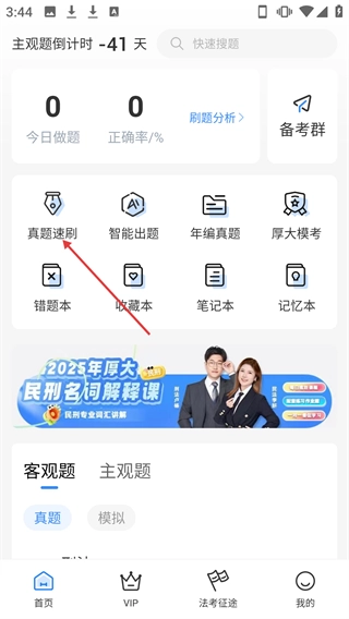 1、在法考首页点击【真题速刷】进入刷题页面。