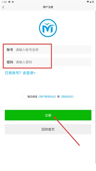 4、新用户进入注册页面,填写账号和密码,勾选相关协议后点击【注册】按钮,即可完成账号创建流程。