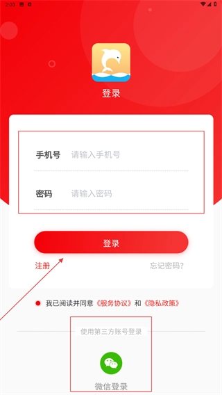 2、在登录界面,填写【手机号】与【密码】,点击【登录】按钮,或选择【微信登录】完成账号登录。