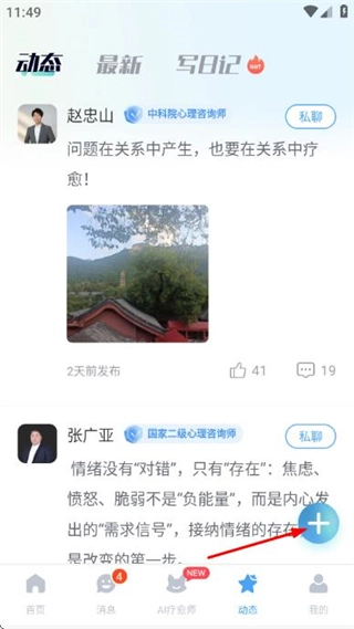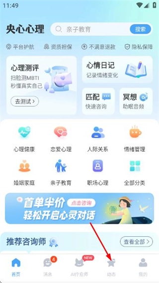 1、在央心心理首页点击底部的动态,进入动态页面。