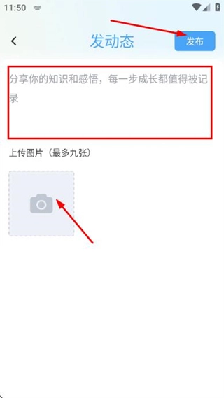3、进入发动态页面填写内容,点击相机图标上传图片后,点击发布按钮就能完成动态发布。