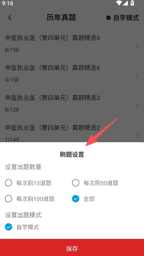 2、具备刷题设置功能,用户可进入设置页面选择出题数量与自学模式,完成保存后即可进行对应题量的真题练习。