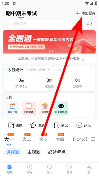 1、打开蓝基因,点击右上角添加题库,进入题库。