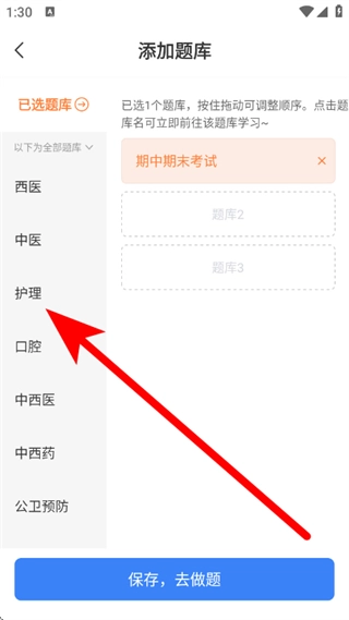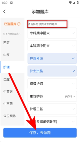 3、在右侧勾选想要添加的护理类题库后,点击保存按钮,即可进入做题环节。